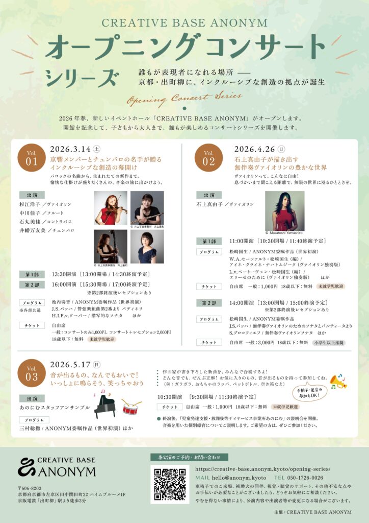 2026年3月、京都・出町柳に新しいイベントホール「CREATIVE BASE ANONYM」が誕生します。開館を記念して、京都ゆかりのアーティストをゲストにお呼びし、3名の作曲家による「ANONYM」をテーマとした委嘱作品等を取り上げるコンサートシリーズを開催します。